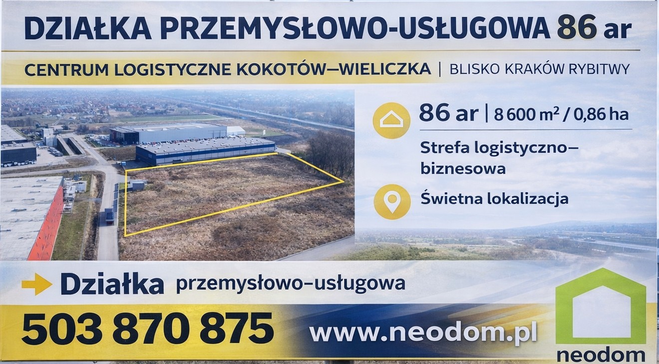 DZIAŁKA PRZEMYSŁOWO-USŁUGOWA 86 ar | CENTRUM LOGISTYCZNE KOKOTÓW–WIELICZKA | BLISKO KRAKÓW RYBITWY
