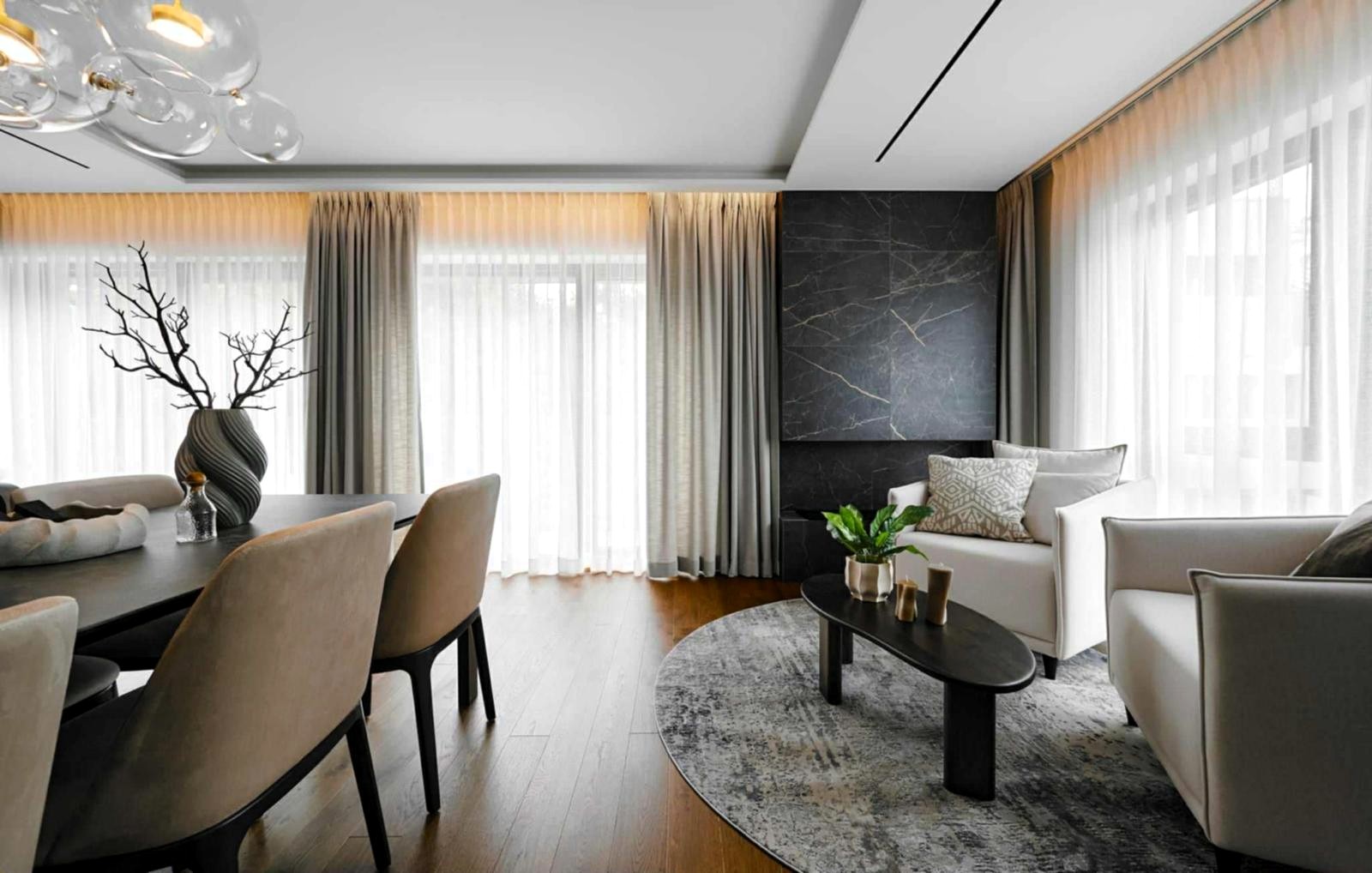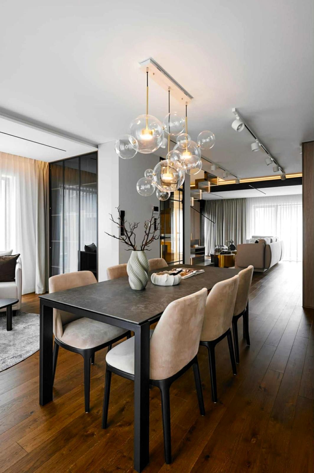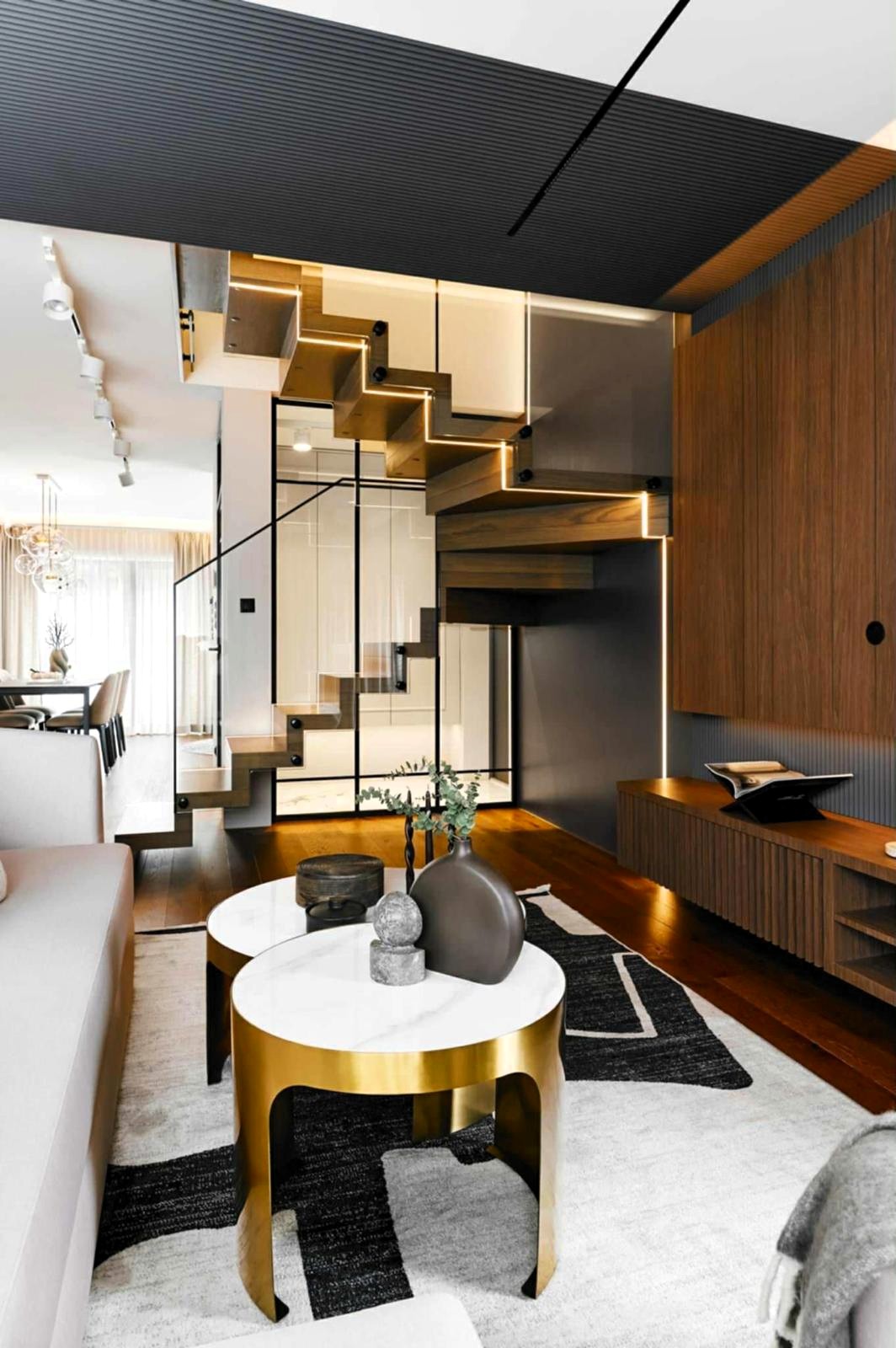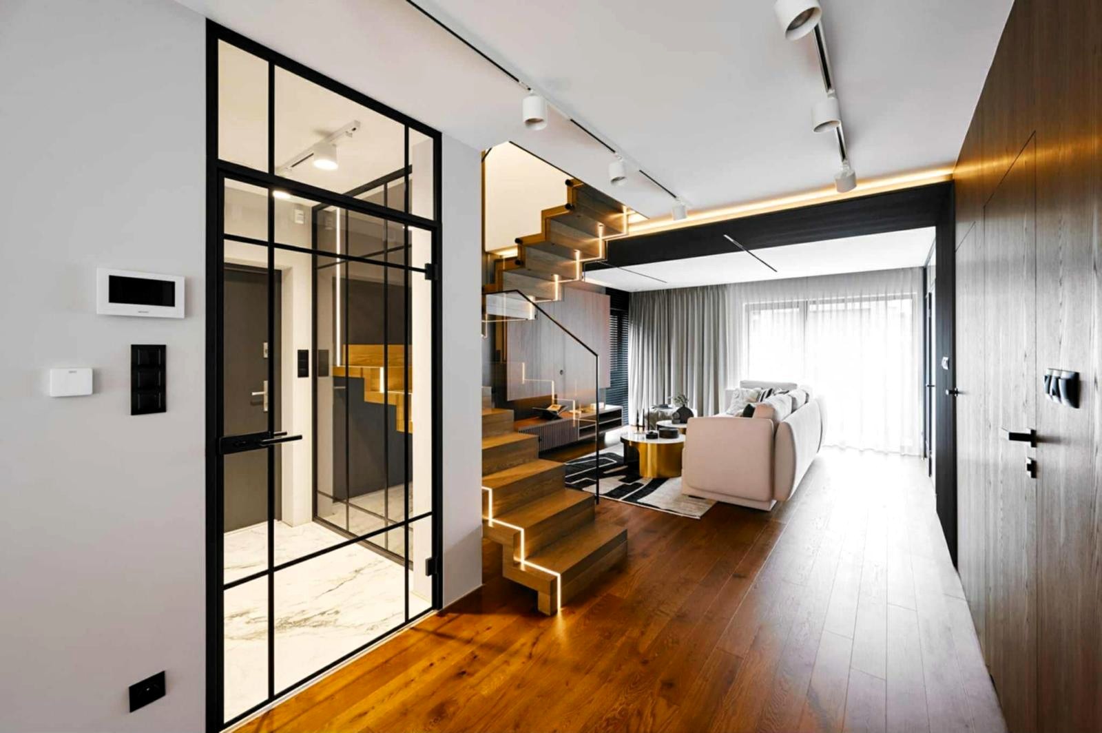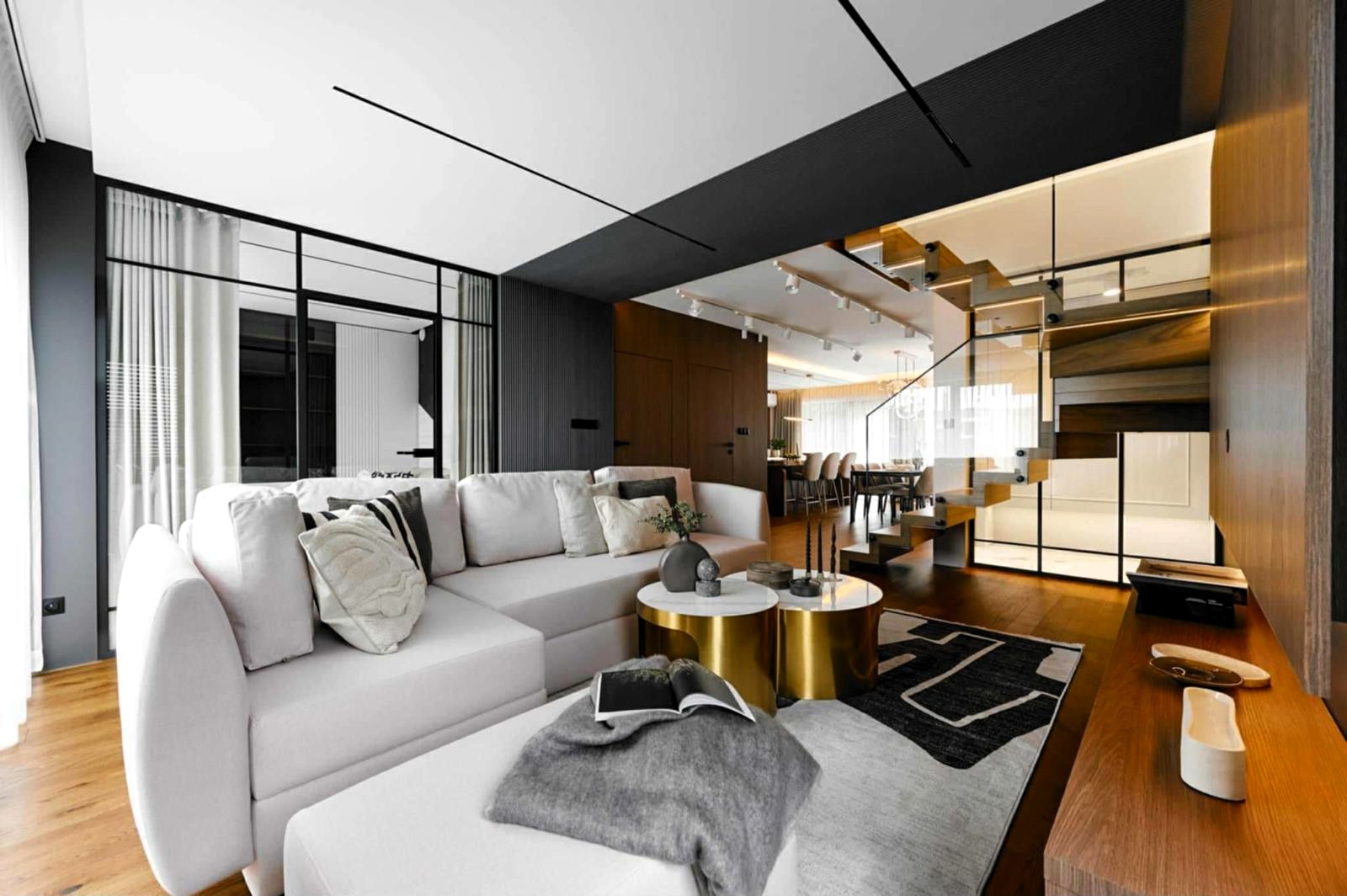 Apartament o powierzchni 151 m² został zaprojektowany jako komfortowa, dwupoziomowa przestrzeń, która łączy nowoczesny design z funkcjonalnością.