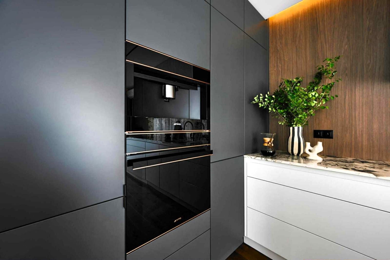 Apartament został wykończony z wysokiej jakości materiałów i wyposażony w nowoczesne rozwiązania: