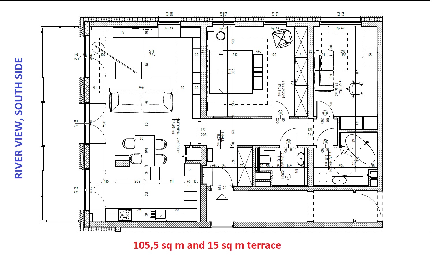 - sunny large 15 sqm terrace on the south side with a view of the river,